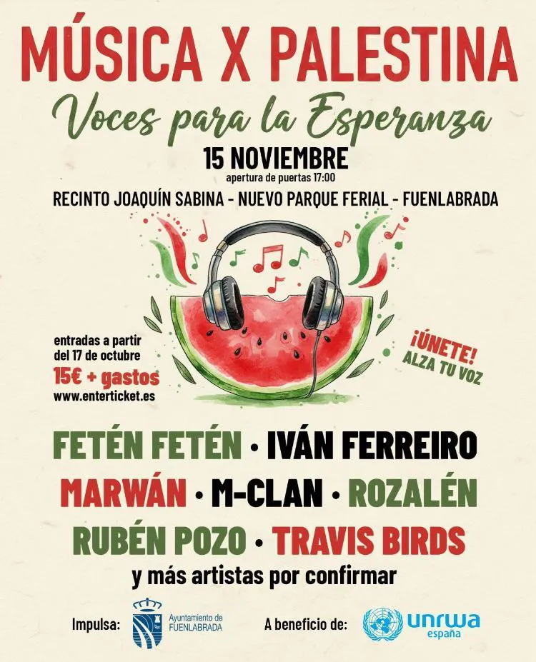 El próximo 15 de noviembre, Fuenlabrada acoge el concierto solidario Música x Palestina – Voces para la Esperanza, con artistas de primer nivel y una