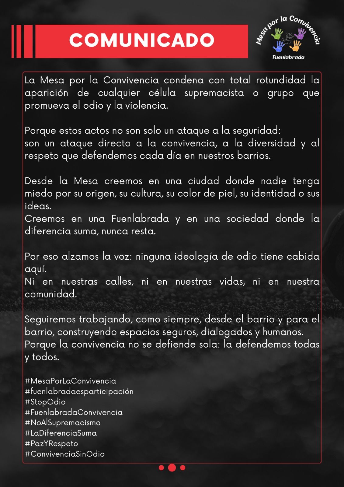 Desde la Mesa por la Convivencia de Fuenlabrada reafirmamos nuestro compromiso con una ciudad que reconoce, acoge y valora la diversidad. Hoy más que nunca, defendemos una convivencia basada en la igualdad, la dignidad y los derechos humanos.