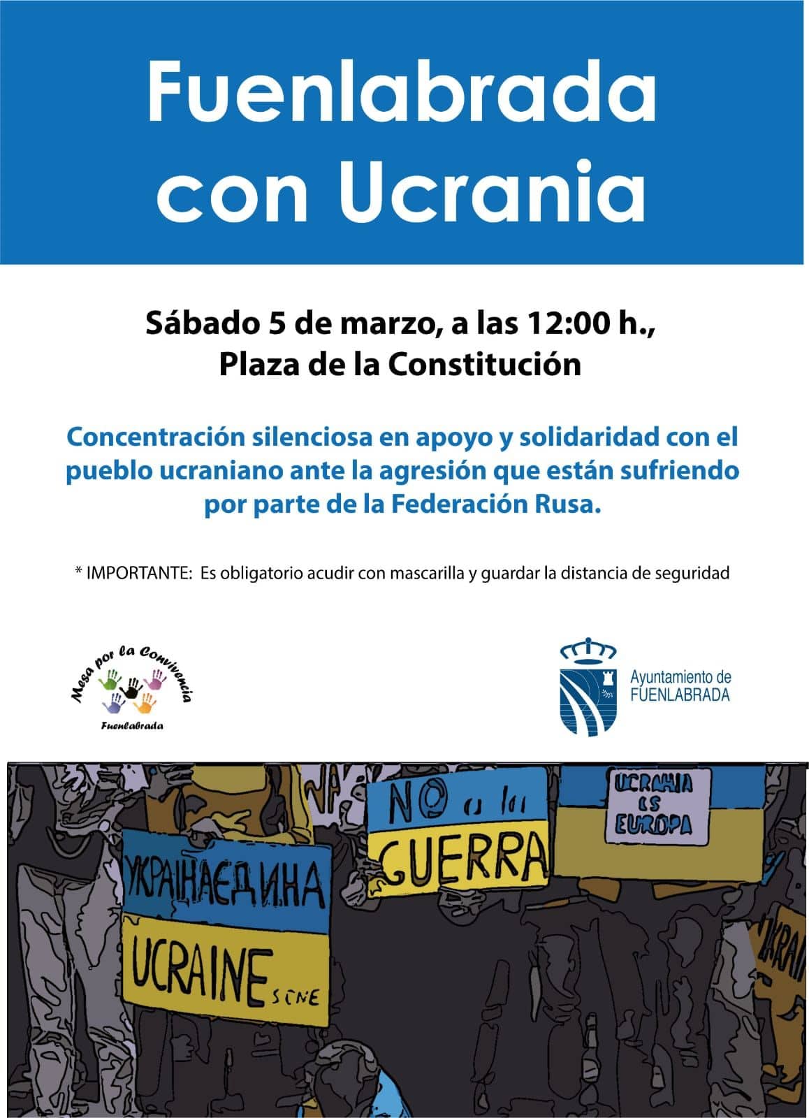Este sábado 5 de Marzo hay convocada una concentración silenciosa por parte de la Mesa por la Convivencia de Fuenlabrada junto con el Ayuntamiento de Fuenlabrada para mostrar nuestro apoyo y solidaridad hacia el pueblo ucraniano debido a la agresión que está sufriendo por parte de la Federación rusa.