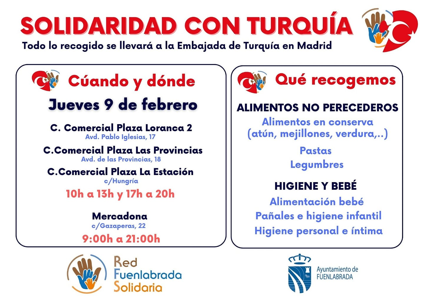 Concluye la recogida solidaria llevada a cabo por la Red Fuenlabrada Solidaria y el Ayuntamiento de Fuenlabrada. La Red se activó ayer 9 de febrero para recoger comida, material de higiene y productos infantiles para las personas damnificadas por el terremoto de Turquía y Siria.